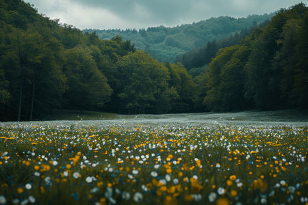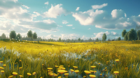 Vibrant wildflower meadow with forest and cloudy sky in summer. That the image is generated using AI.