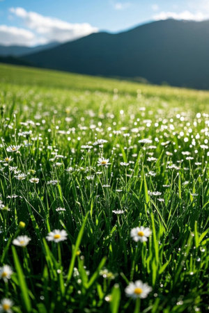 Close-up view of lush green grass covered in dew drops and small white daisies, bathed in sunlight under a blue sky...