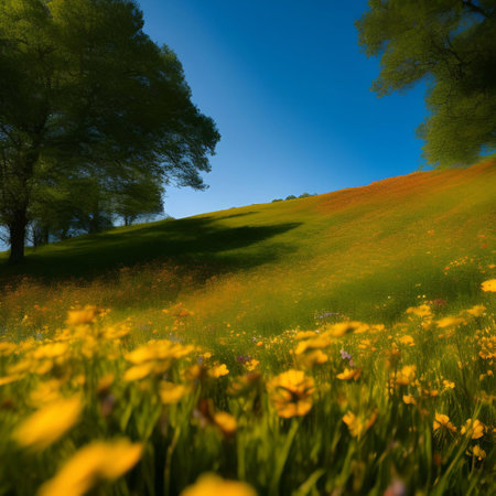 Cinematic view of rolling hills adorned with vibrant wildflowers under a clear sky