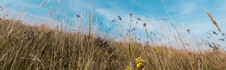 Meadow Sunset panorama View: Serene Nature Landscape Colorful Sky. Wide Countryside rye wheat field in the summer on cloudy sky background. World environment day concept: Green energy carbon credit.