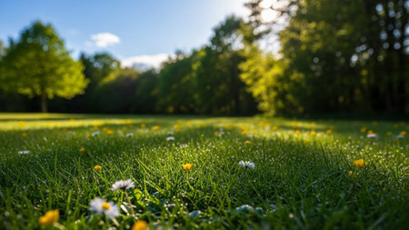 Generative AI : Beautiful wide format image of a pristine forest lawn with fresh grass and yellow dandelions against a defocused background