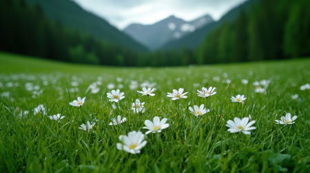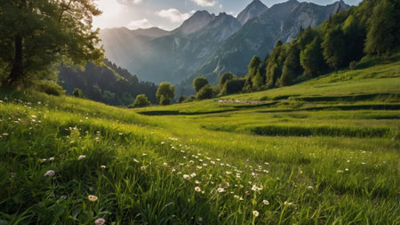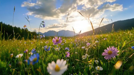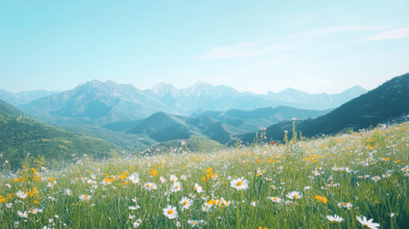 Colorful wildflowers flourish in a sun-drenched meadow, creating a peaceful atmosphere. Majestic mountains rise in the distance, illuminating the beauty of nature in full bloom.