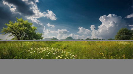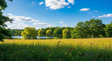 A beautiful countryside scene featuring a lush meadow filled with wildflowers, gentle hills, and a clear blue sky, radiating tranquility and warmth.