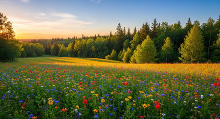 Sunlit meadow with vibrant wildflowers at sunset. Peaceful, idyllic scene.