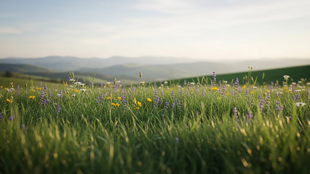 Cinematic view of rolling green hills adorned with vibrant wildflowers at golden hour