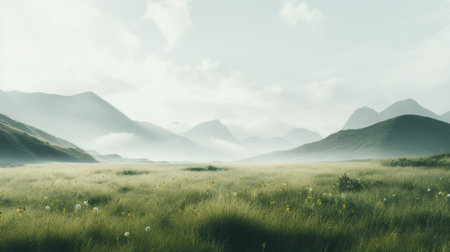 mountain and green grasses on a hill, delicately rendered landscapes with hazy atmospheres. this photo captures the essence of nature with its pastoral landscapes and monochrome beauty. shot with an m42 mount, the image showcases the stunning scenery in a style reminiscent of cryengine graphics. ai generated