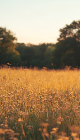 Tall green grass and wildflowers in a sunlit meadow are bathed in warm golden hour light, creating a serene natural...