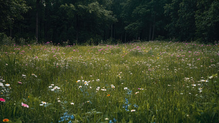A creative digital illustration depicting Commercial art of wildflower meadow blur, soft meadow sunlight, pastoral idyllic mood, wild colors. This AI-generated artwork features unique visual elements suitable for various commercial and editorial applications. AI-generated illustration.