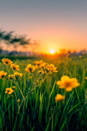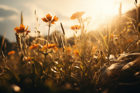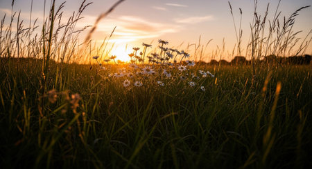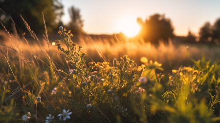 Wildflowers bathed in the warm glow of sunset. A tranquil scene of nature's beauty.