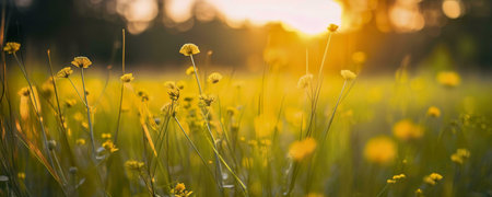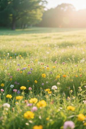 Scenic meadow with wildflowers and bright sunlight, nature landscape