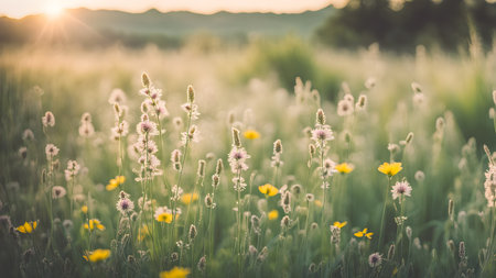 Tall green grass and wildflowers in a sunlit meadow are bathed in warm golden hour light, creating a serene natural...