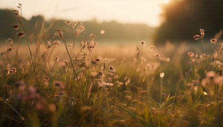 Soft dew on bright wildflowers in tranquil meadow at dawn generated by artificial intelligence