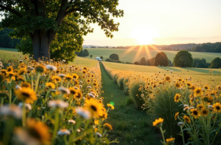 Sunlit meadow with vibrant wildflowers at sunset. Peaceful, idyllic scene.