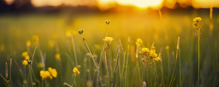 A captivating view of a field bathed in the golden glow of sunset. The sun's rays illuminate the tall grass and wildflowers, creating a vibrant and ethereal scene.