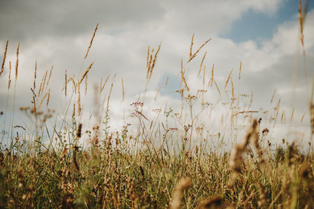 Herbs and grasses in sunset light in summer meadow, selective focus. Wildflowers close up in warm light, summer in countryside. Tranquil beautiful rural moment. Wild grass