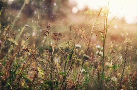 Rainy view of wild natural grass during heavy downpour, with water drops, illuminated by sun. Natural environment concept.
