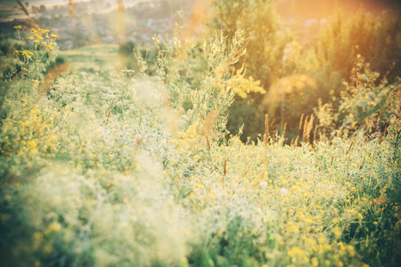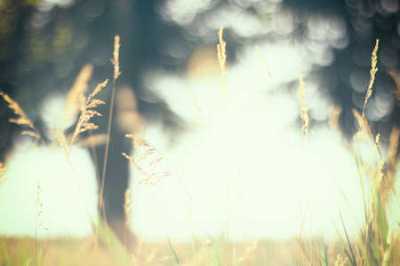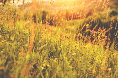 Warm vintage blurry photo of summer meadow at sunset. Vintage filter effect used.