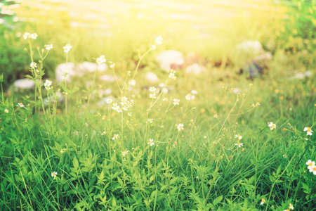 Summer meadow landscape. Green grass, sunshine. Wildflowers valley, blurred background