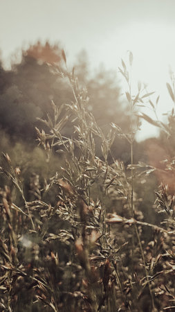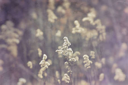 Dry plants in the meadow close-up. Wild dry field plants in autumn at sunset. Added vintage photo effect