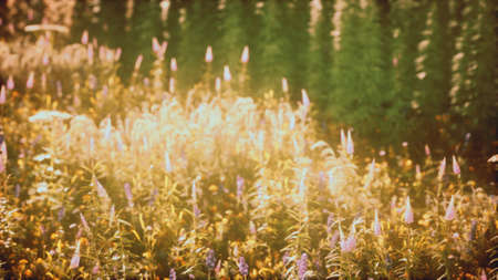 Meadow flowers and grasses illuminated by the warm sun on a summer field, an abstract bright natural background for your design.