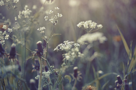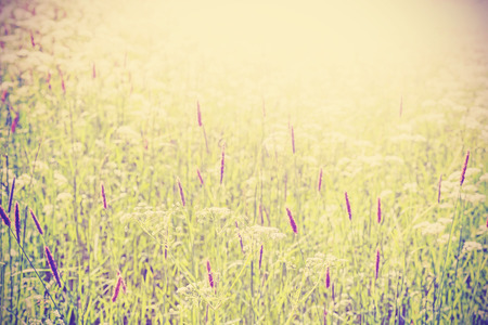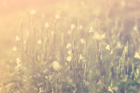 Wild flowers and grass in vintage pastel style, with soft focus and sunset lighting effect