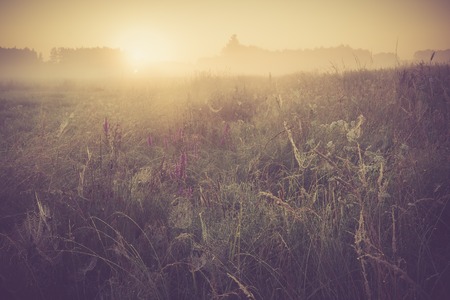 Beautiful photo of rural foggy meadow landscape photographed at sunrise. Landscape with vintage mood usefull as background.