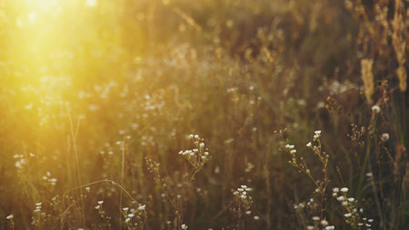 Wildflowers bathed in the warm glow of sunset. A tranquil scene of nature's beauty.