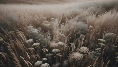 weeds and herbs covered with hoar frost in a foggy day during winter season