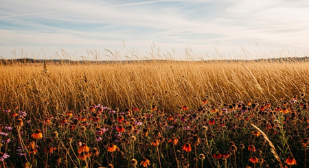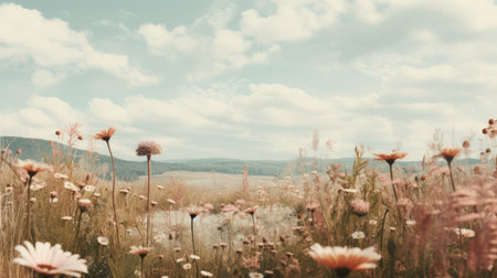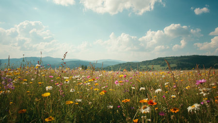 Scenic landscape with vibrant wildflowers in a sunny field, showcasing the beauty of nature and tranquility, ideal for spring and summer themes