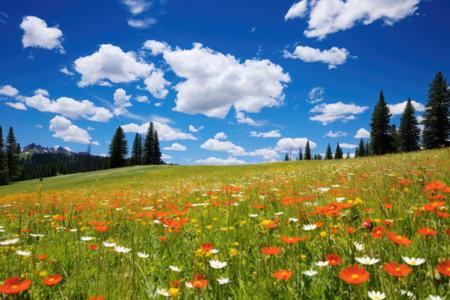 Meadow with poppies and mountains in the background, A sunny meadow dotted with colorful wildflowers and fluffy clouds overhead, AI Generated