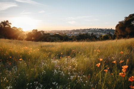 Serene sunset casts a warm glow over a wildflower field with a town in the distance
