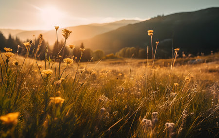 A stunning view of a mountain meadow at sunset, with golden rays of light illuminating the field and the surrounding hills.