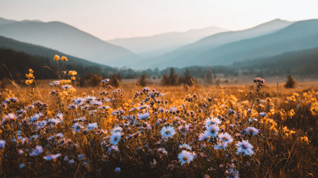 A breathtaking view of wildflowers in a golden meadow, framed by majestic mountains under soft sunlight, perfect for nature lovers and photographers.