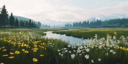 A serene view of a mountain meadow filled with wildflowers in the Rockies. No people, copy space.