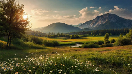 Breathtaking Serene Alpine Meadow Bathed in Golden Sunlight with Majestic Mountain Peaks in View