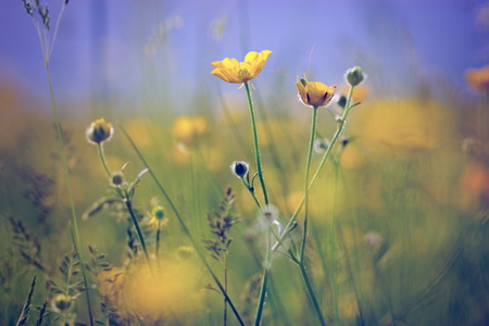 Beautiful springtime buttercups flowers growing on wild meadow.