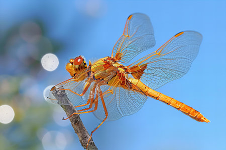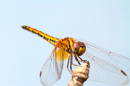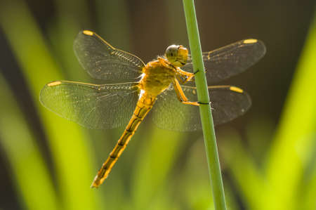 Yellow Dragonfly perched on a stick under the sun