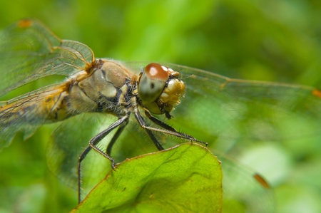 dragonfly on the green leaf macro