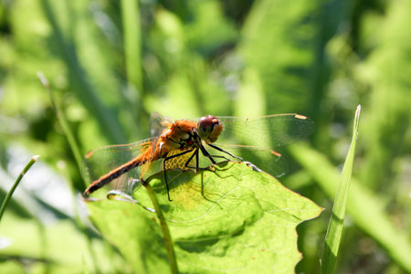 A colorful red ruddy darter dragonfly (Sympetrum sanguineum) resting, sunny day in summer, Vienna (Austria)