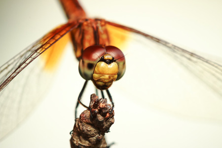 Macro shot of a dragonfly on a white background. Close-up