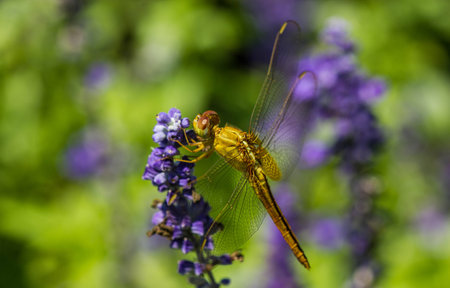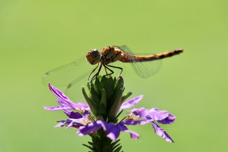 The Common Darter Sympetrum striolatum, male on Lupinus at sunrise in the Netherlands