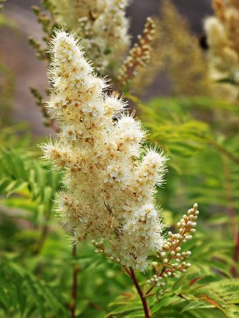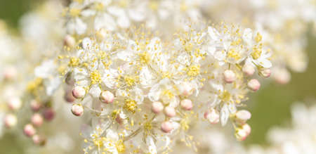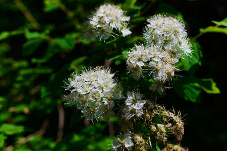 The meadowsweet (Spiraea chamaedryfolia L.). Inflorescences close-up