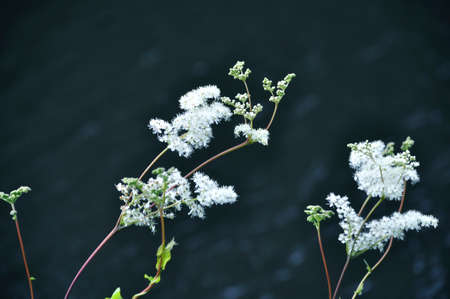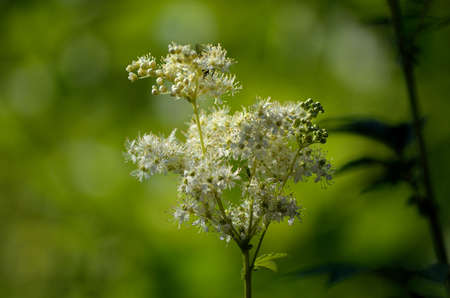 Blooming Meadowsweet (Filipendula ulmari) in the shady forest, closeup with selective focus