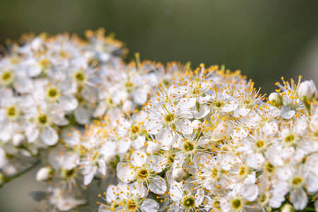 Close up flowers blooming on softness style in spring summer under sunrise. background of little white flowers blooming bush