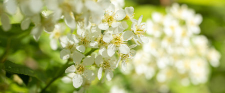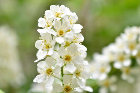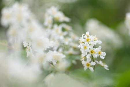 Bird cherry aka hackberry (Prunus padus) tree in full bloom. White flowers in springtime, defocused blurred background.