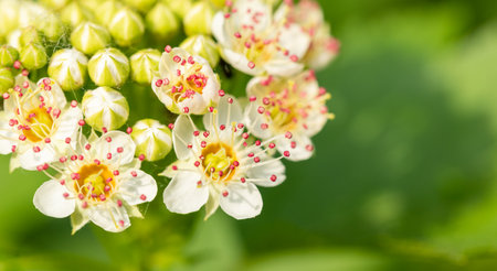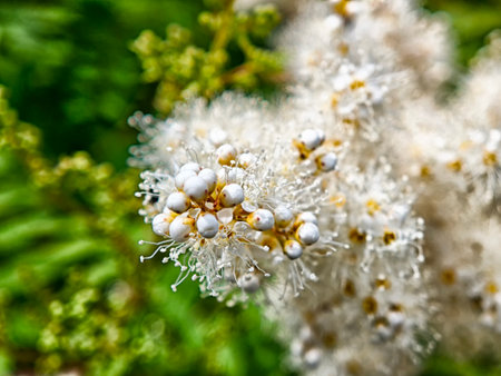 A close-up captures the delicate beauty of Meadowsweet flowers in bloom. Their tiny white petals and yellow centers create a stunning contrast against the green background.