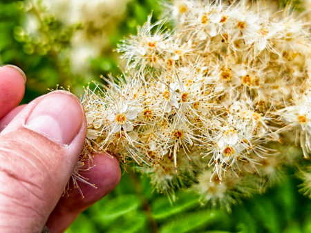 A person gently holds a cluster of small white flowers, showing nature's beauty in a lush garden filled with greenery.