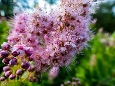 Macro shot of ornamental pink shrub - Bridewort (Spiraea salicifolia) with garden background in summer