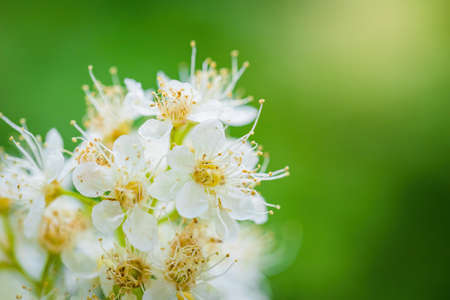 Beautiful white spirea flowers on a green background in the garden