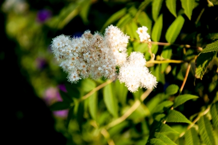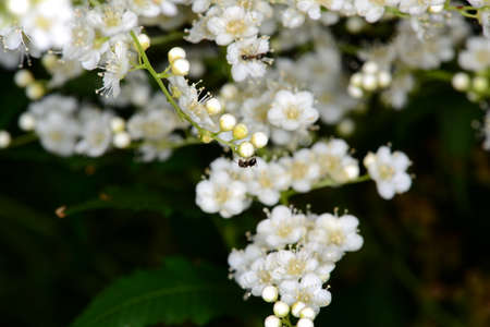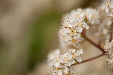 Flowering mountain ash with white flowers and greenery in summer